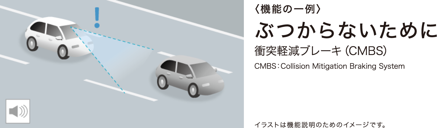 - 衝突軽減ブレーキ(CMBS)は、約5km/h以上で走行中に自車との速度差が約5km/h以上ある車両*や歩行者に対して衝突するおそれがあるとシステムが判断したときに作動し、停止または減速することにより衝突回避や衝突被害の軽減を支援します。
